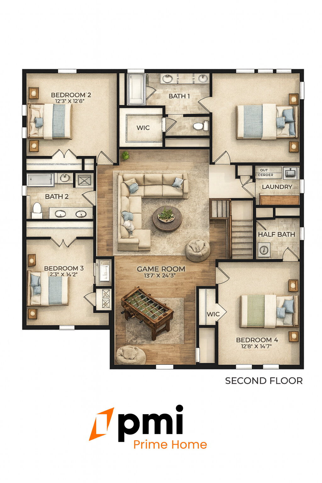 A massive loft serves as the upstairs living room, providing the perfect space for movie nights, a play area, or a second family lounge. Every bedroom is equipped with ceiling fans for added comfort.